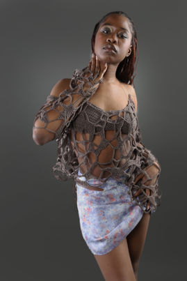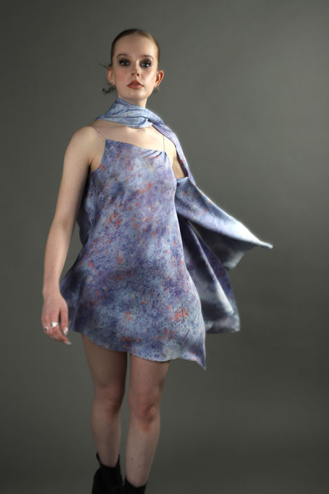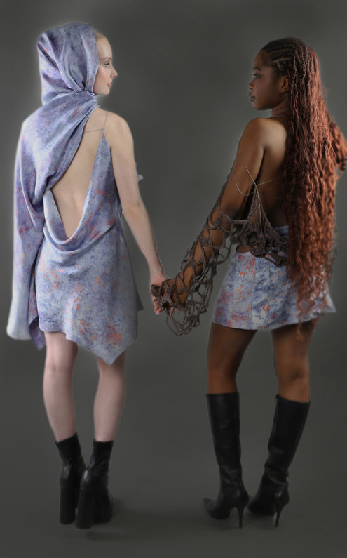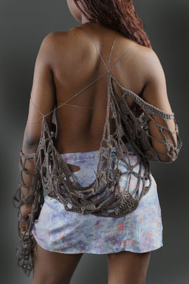 Distant Memory focuses on the future through an eco-feminist lens. A futuristic spin on traditional craft, eco-dyeing, and daring, body-revealing styles reinforce these ideas. Muted tones, natural fibres, hand-dyed fabric and freeform crochet embrace the organic.